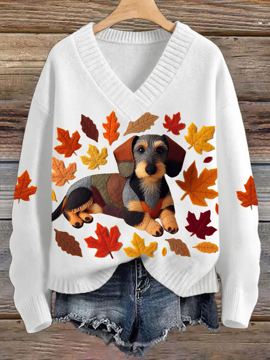 Women's Dachshund Maple Leaf V-neck Imitation Sweater