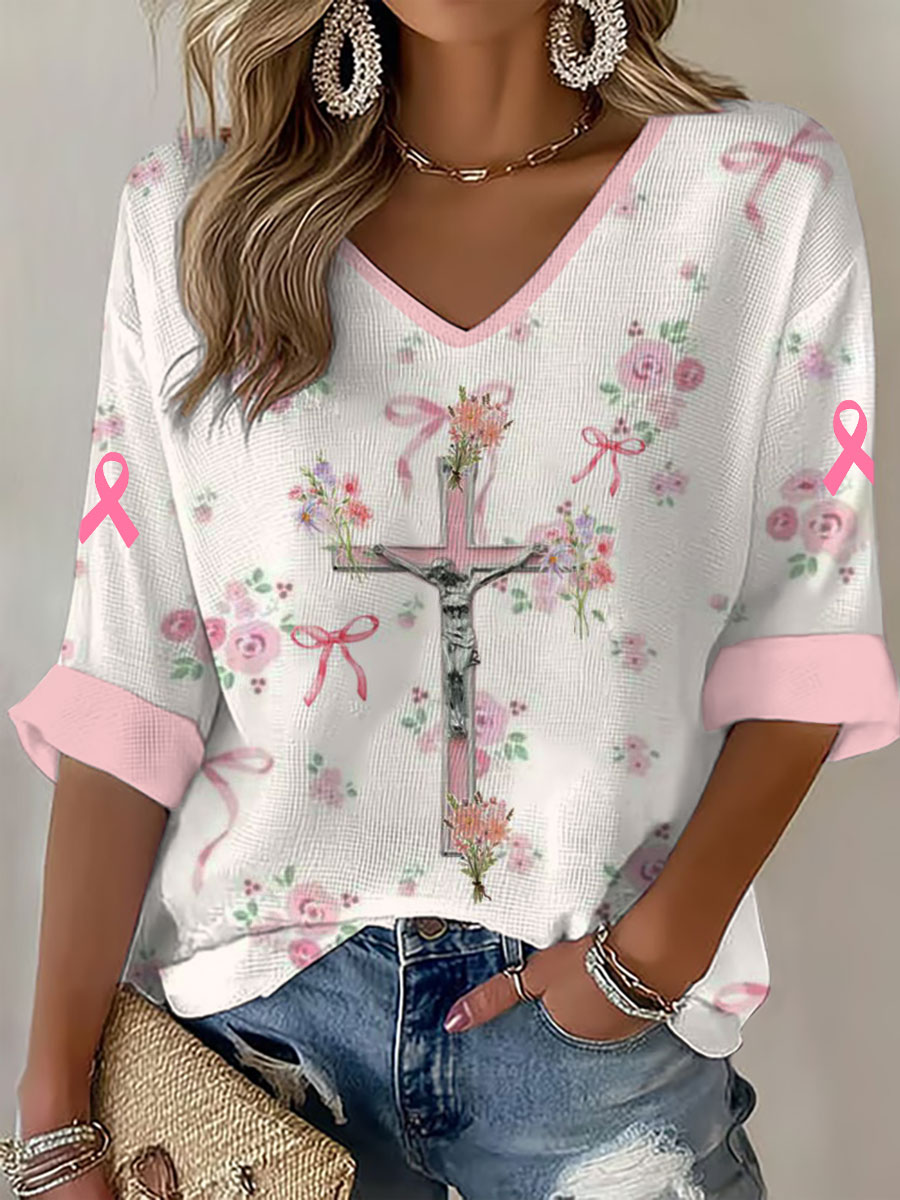 Women's Pink Ribbon Print Casual T-shirt