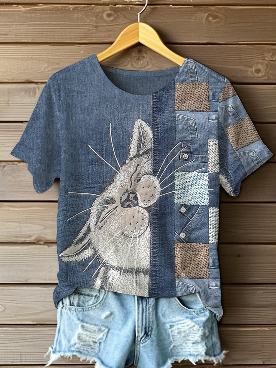 Women's Cute Cat Denim Patchwork Art T-Shirt
