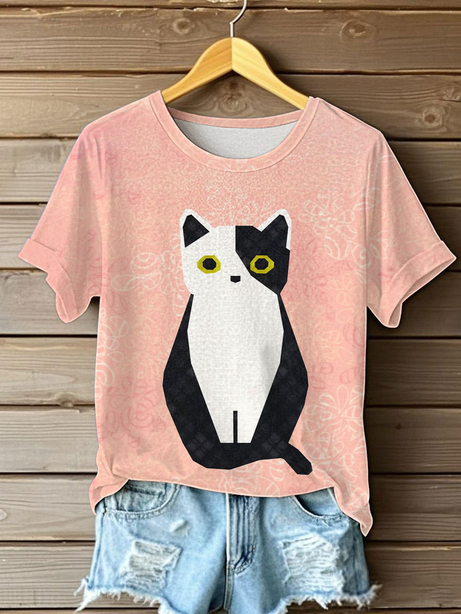 Women's Cat Art Print Vintage Short Sleeve T-Shirt