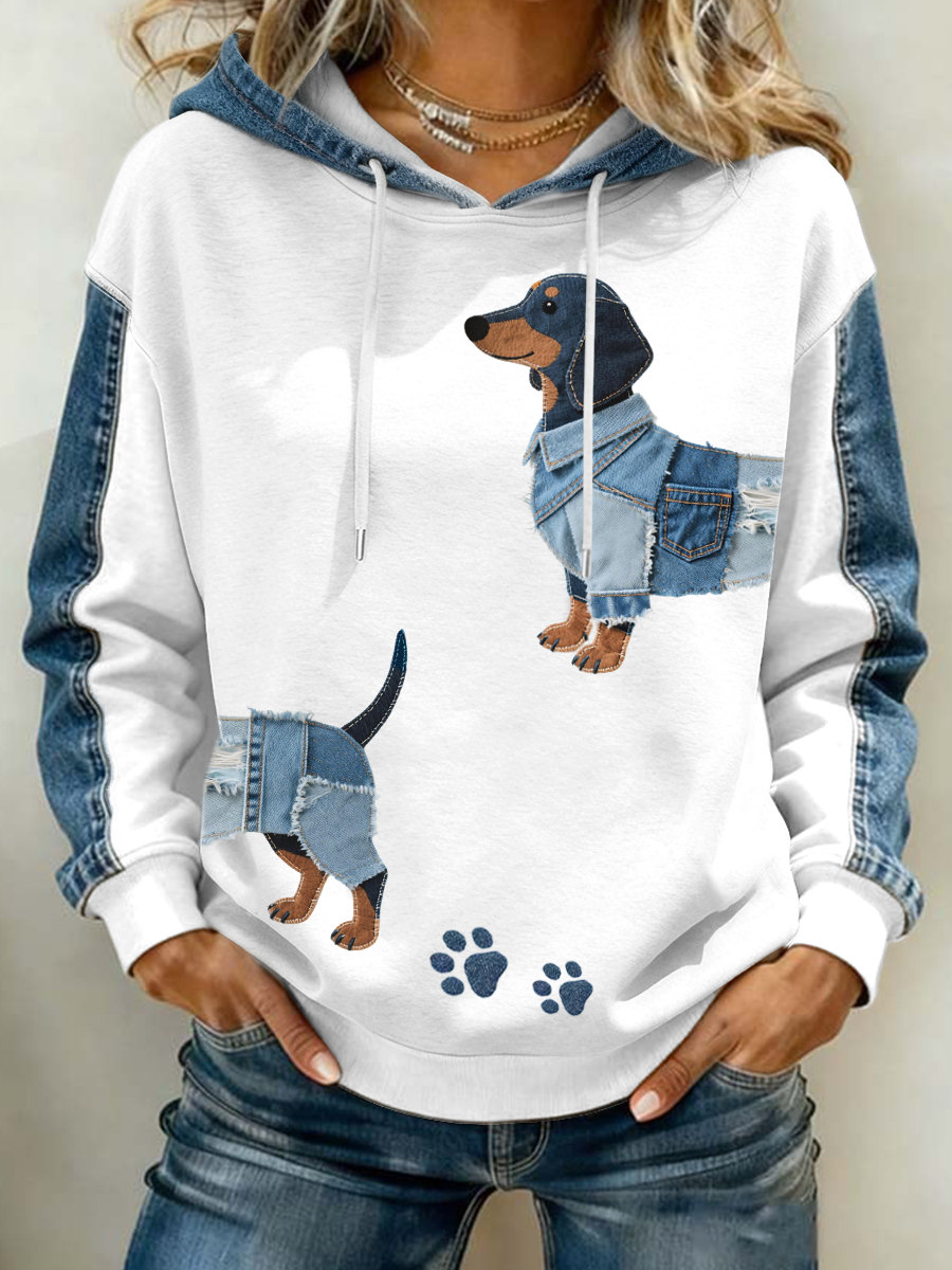 Women's Lovely Dachshund Pattern Denim Patchwork Art Hoodie