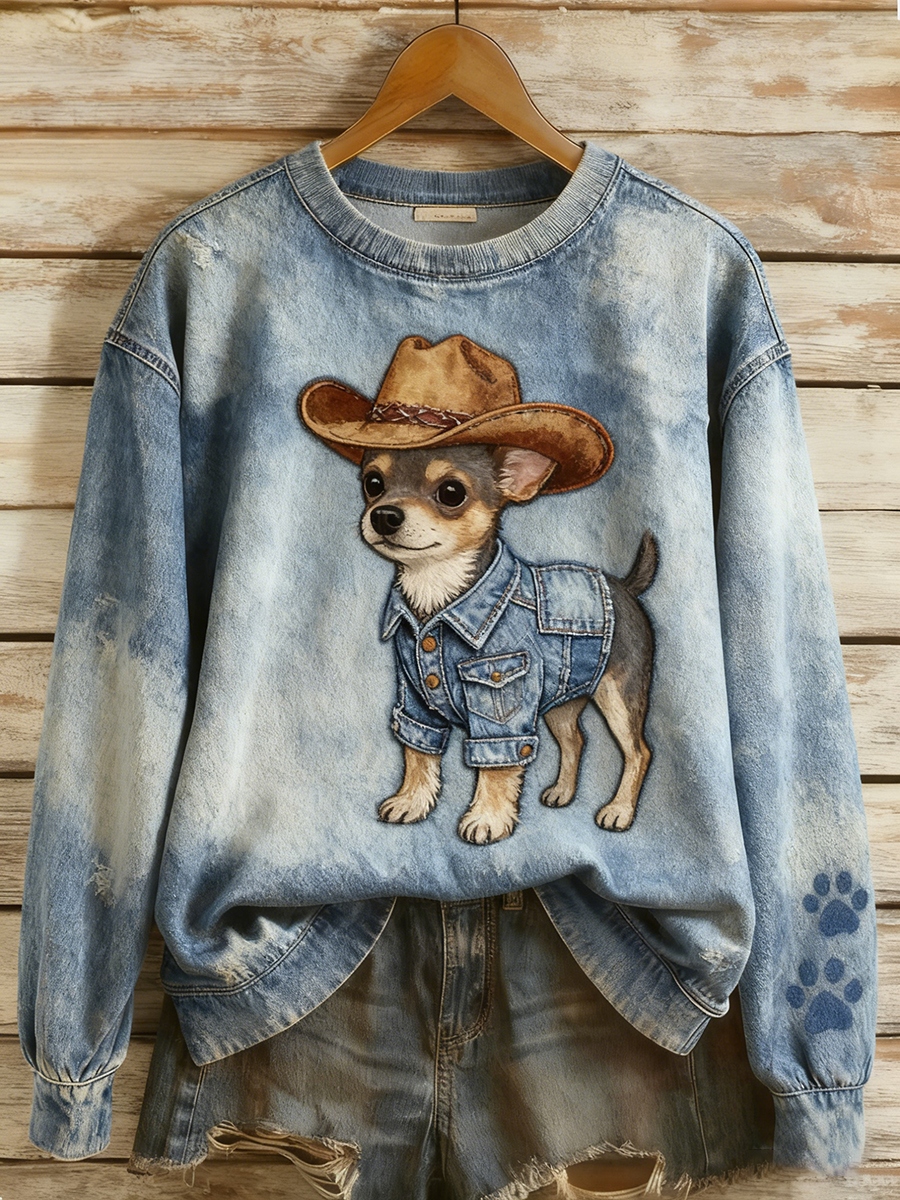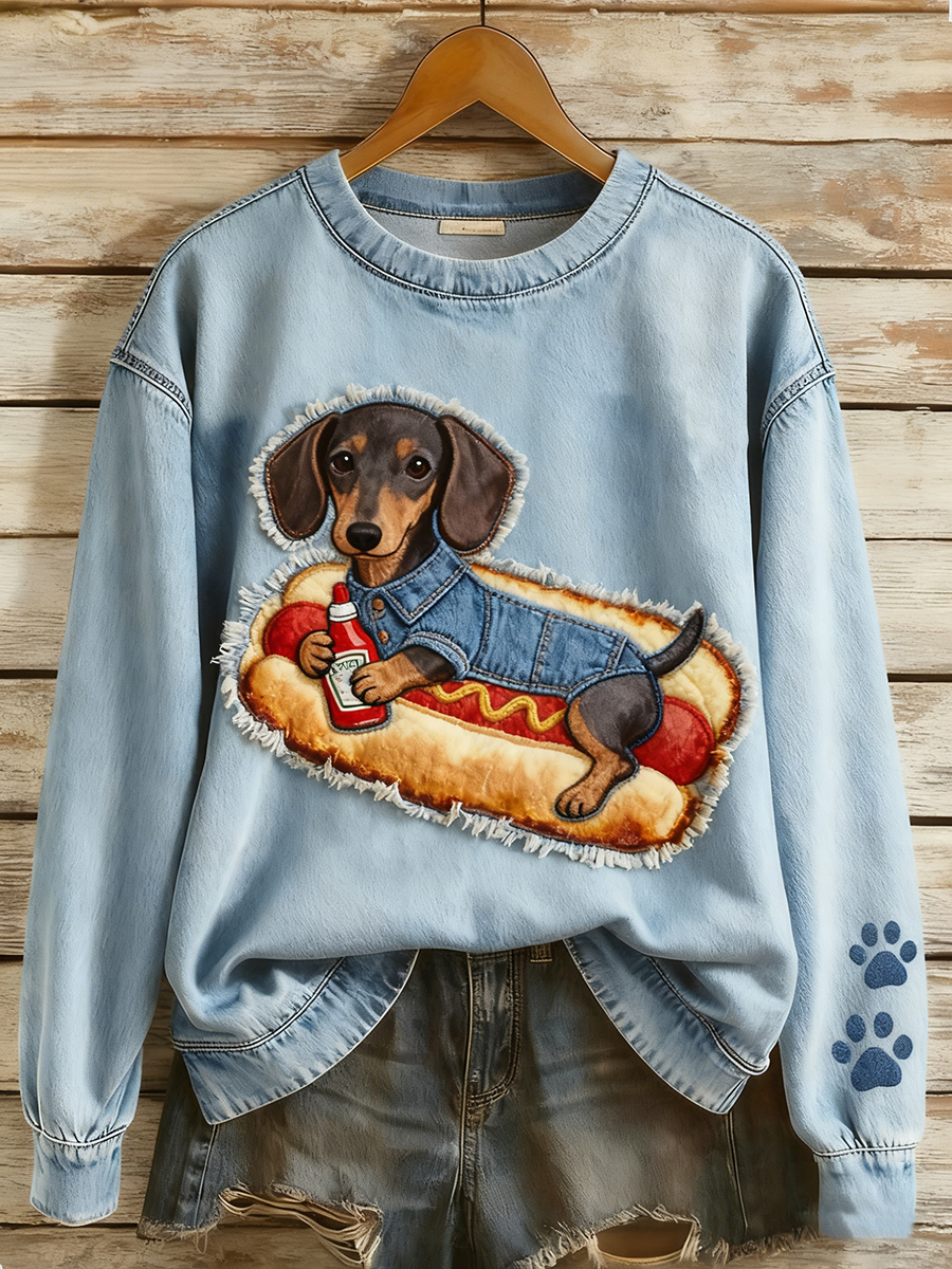 Women's Dachshund Pattern Denim Patchwork Art Sweatshirt