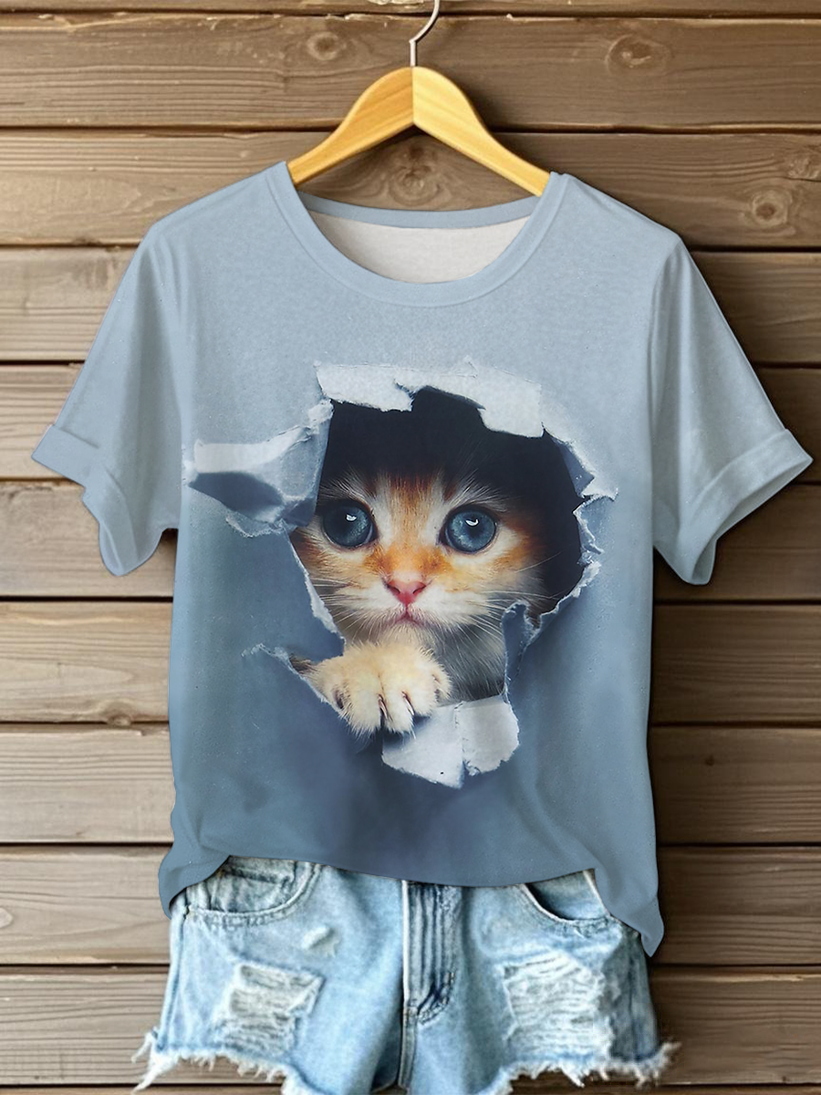 Unisex Oil Painting Art Cat Print Washed T-Shirt