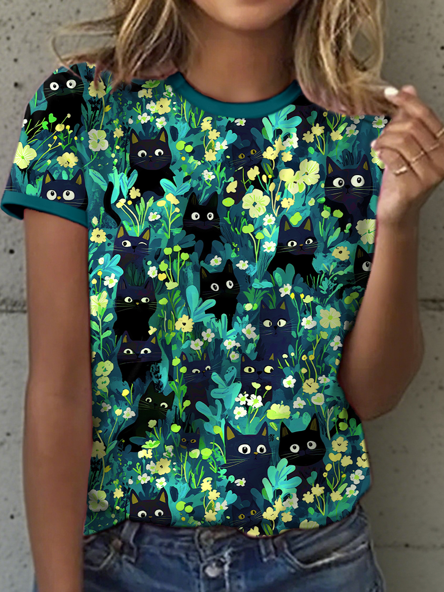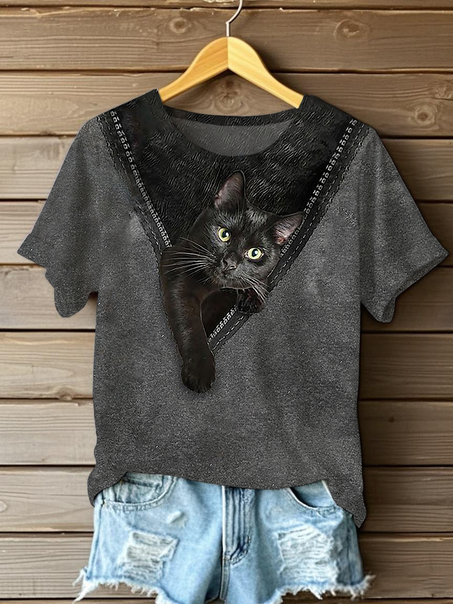 Women's Cute Cat Patchwork V-Neck T-Shirt