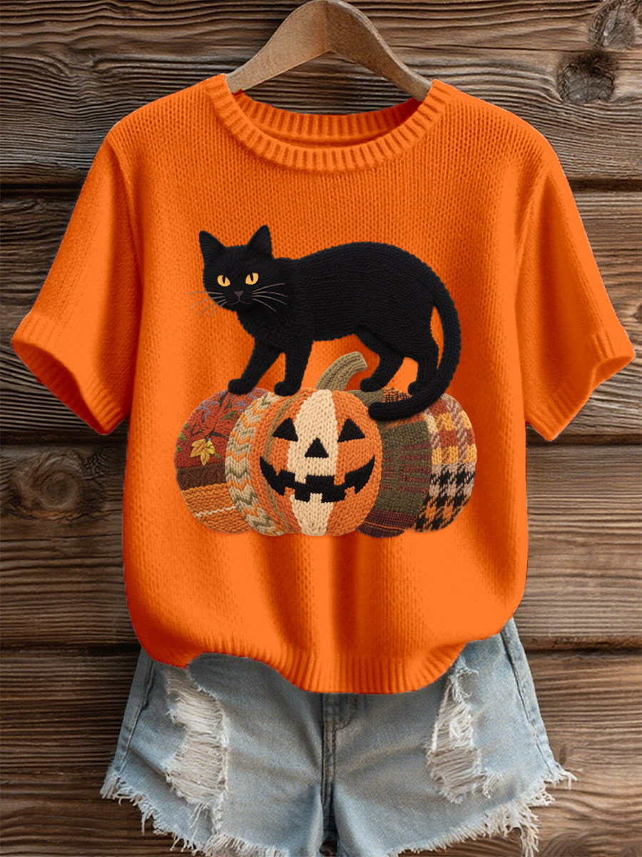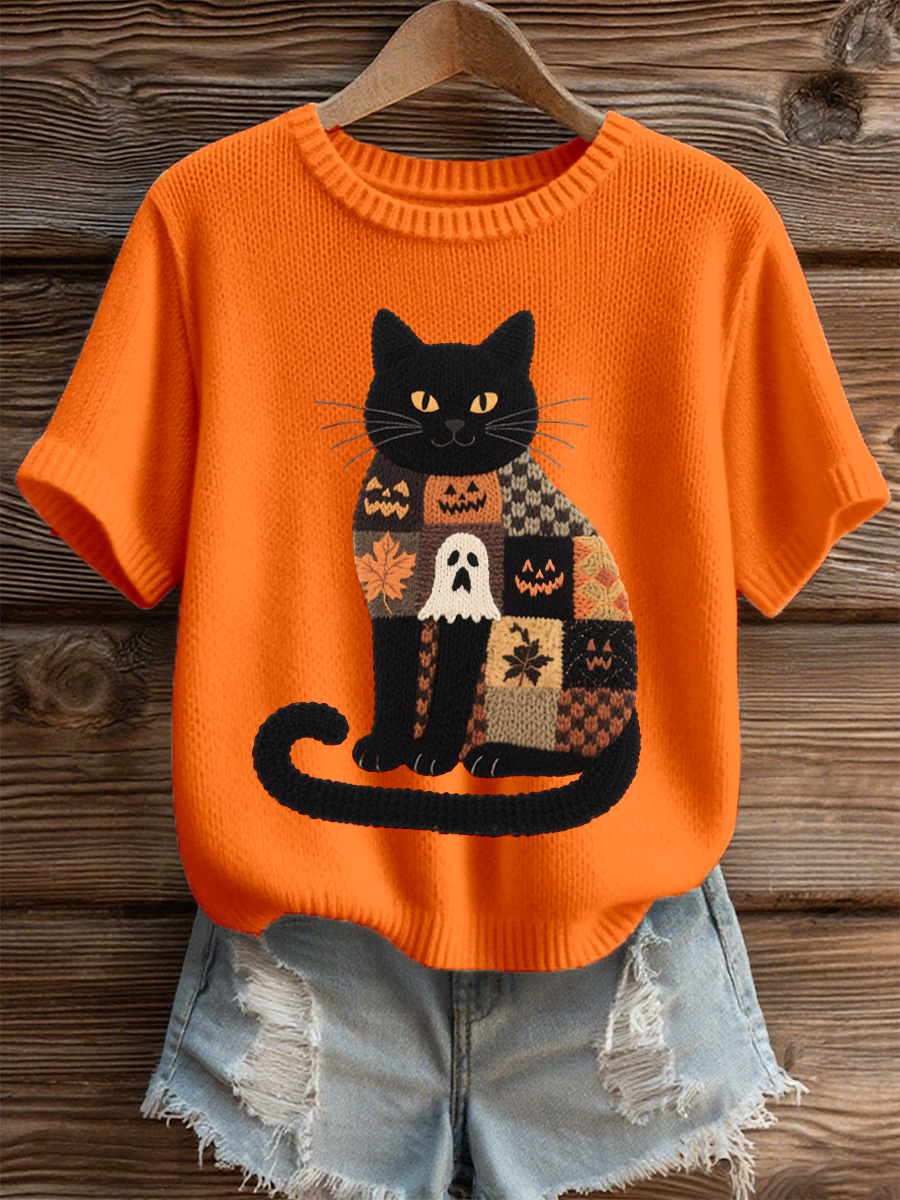 Women's Halloween Black Cat Pattern Cozy Knit Top