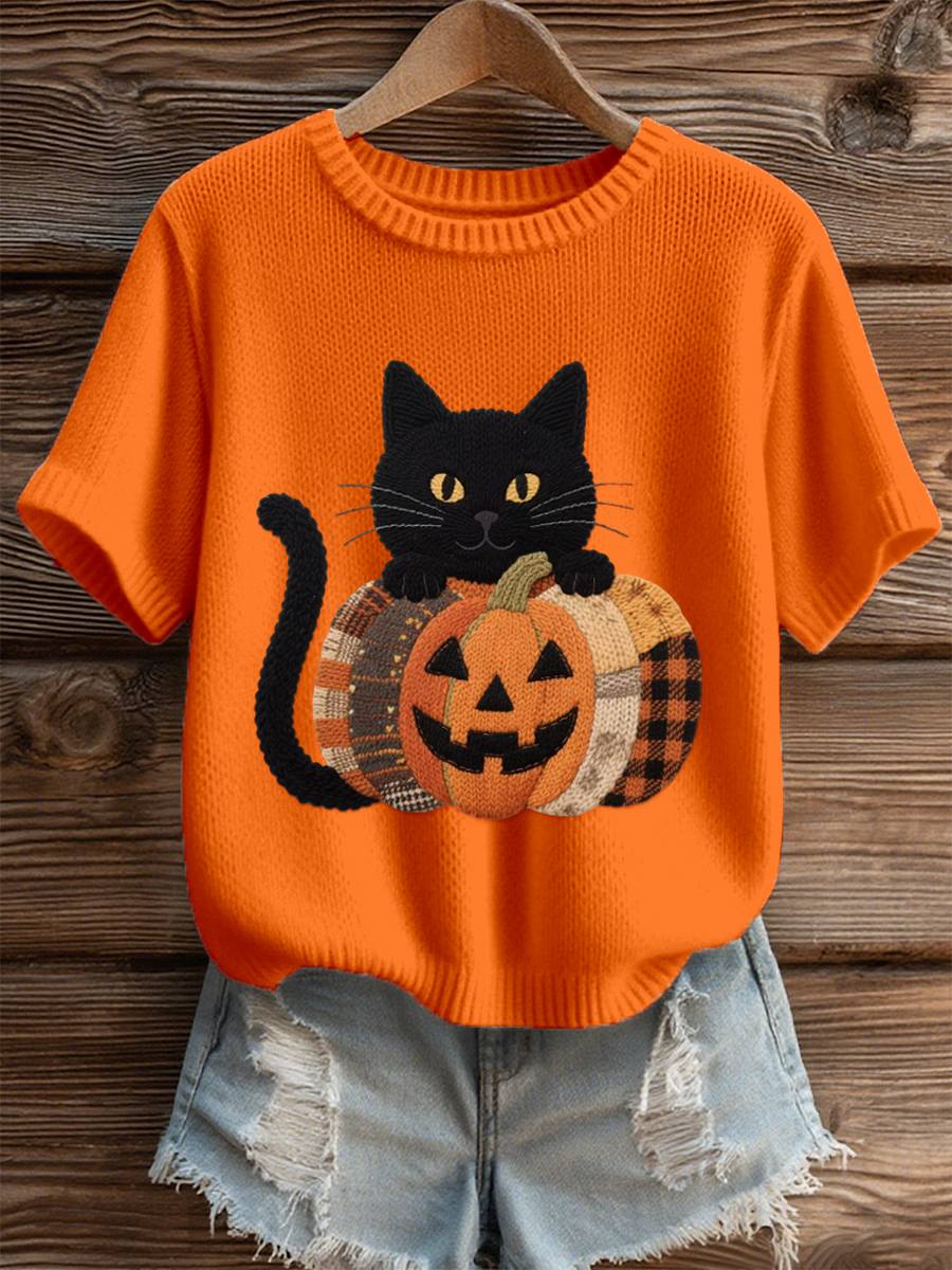 Women's Halloween Black Cat Embroidered Cozy Knit Top
