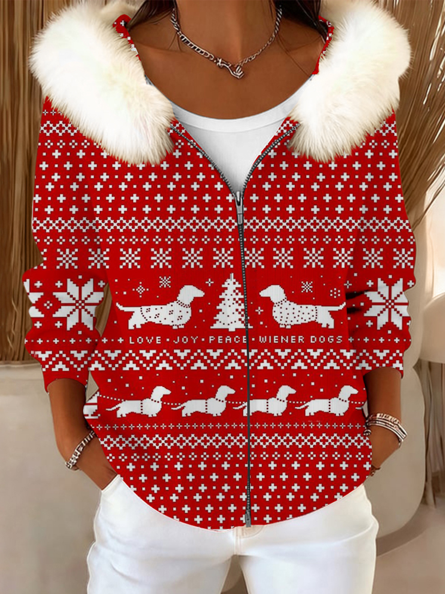 Women's Christmas Vibrant Red Wiener Dog Print Fur Collar Jacket