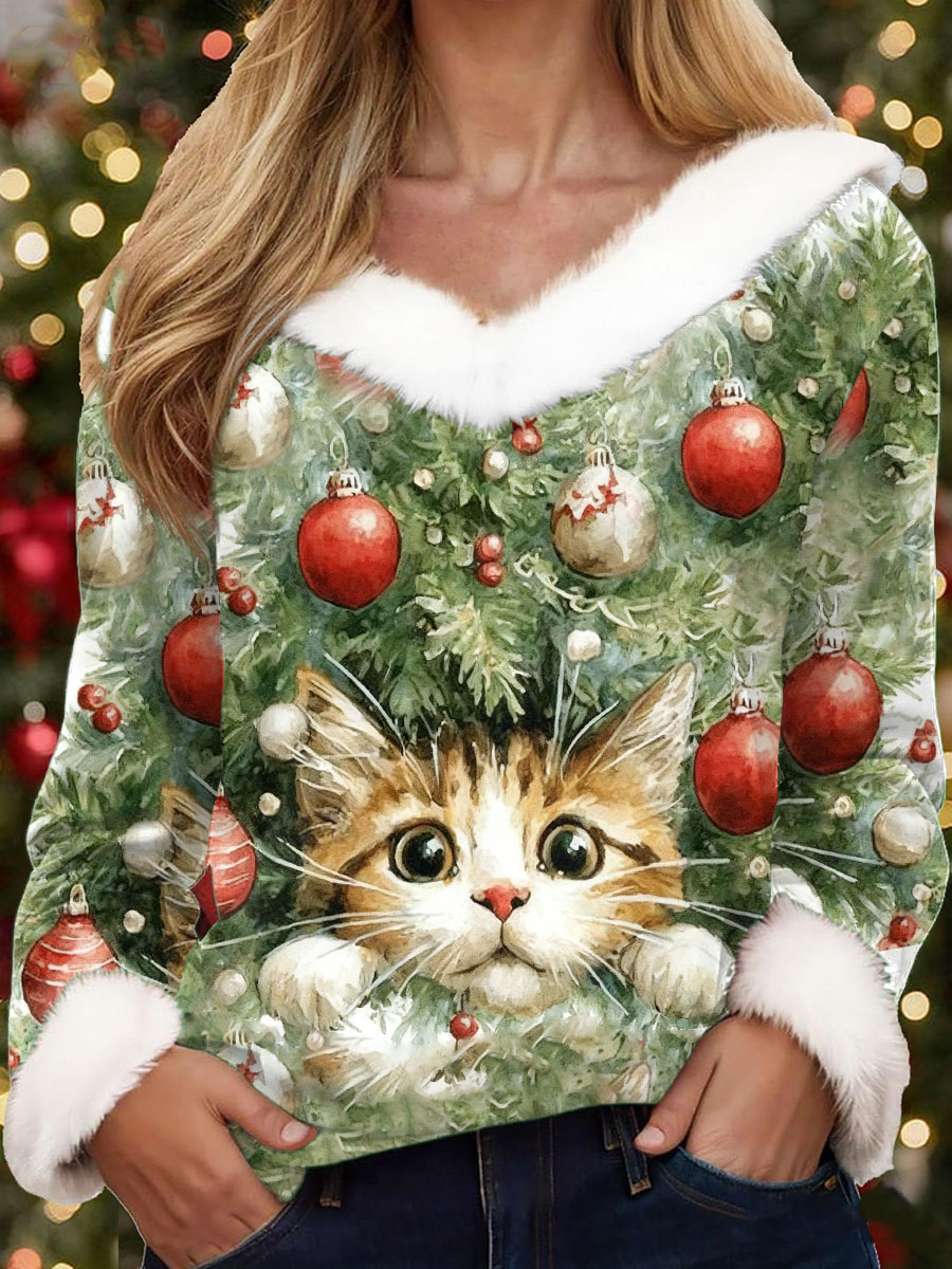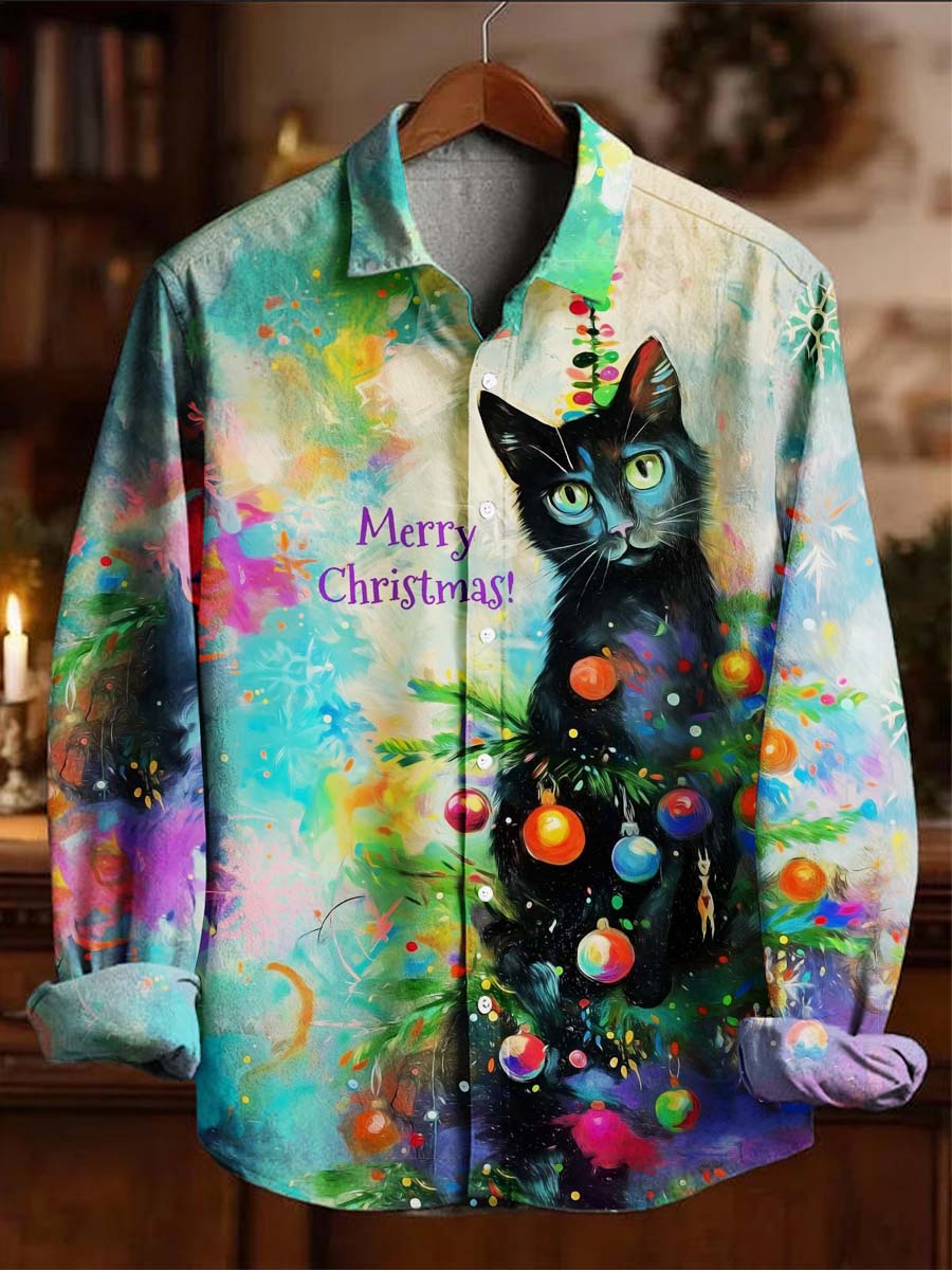 Christmas Cat Print Casual Long-Sleeve Shirt