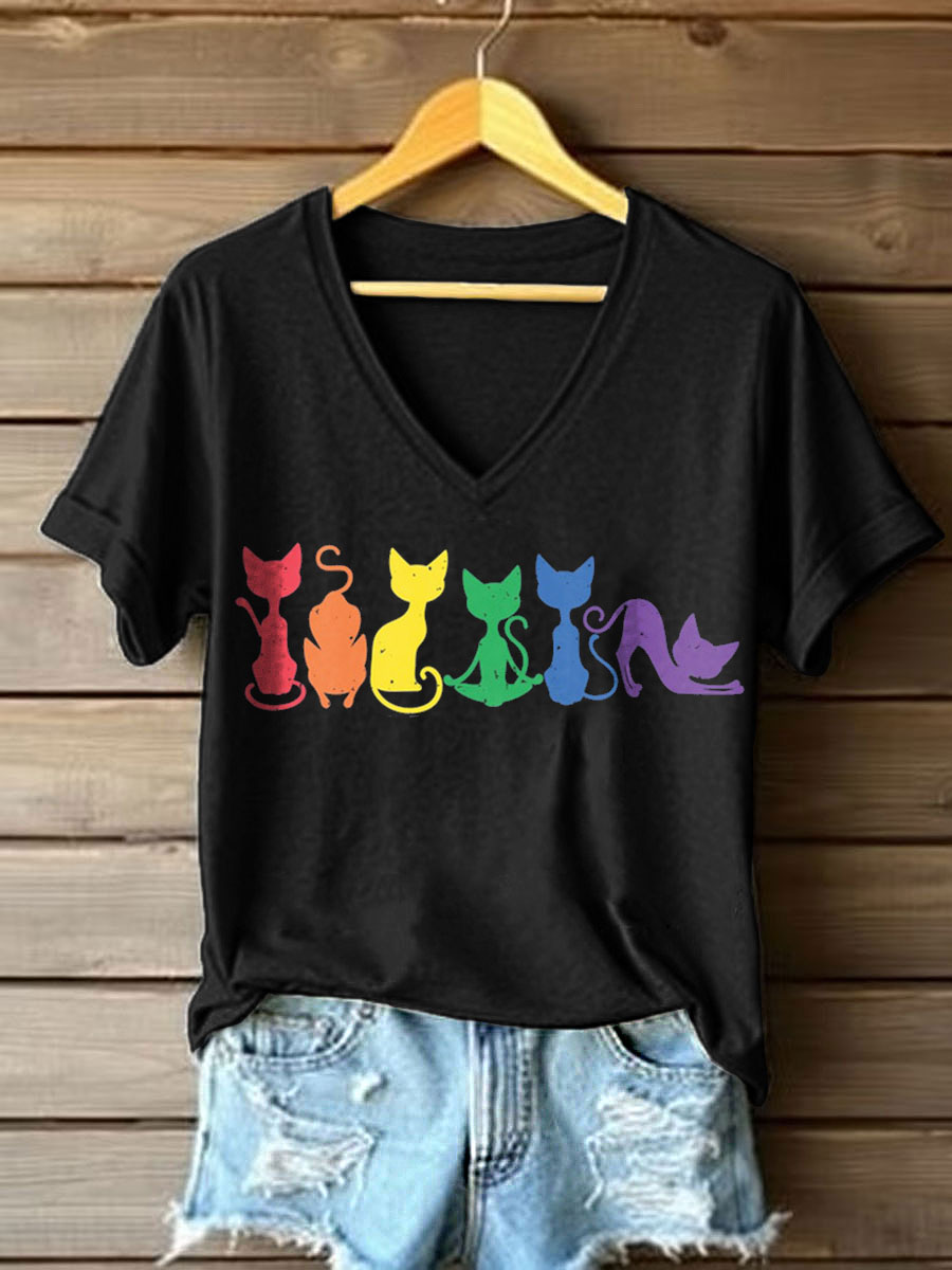 Women's Rainbow Colors Cat Print V-Neck T-Shirt