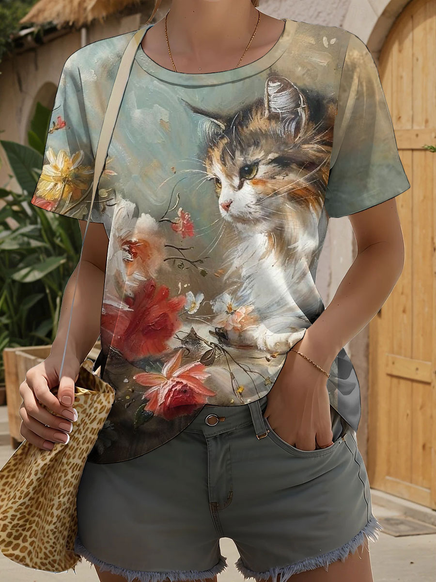 Women's Oil Painting Cute Flowers Cat Short-sleeve T-shirt