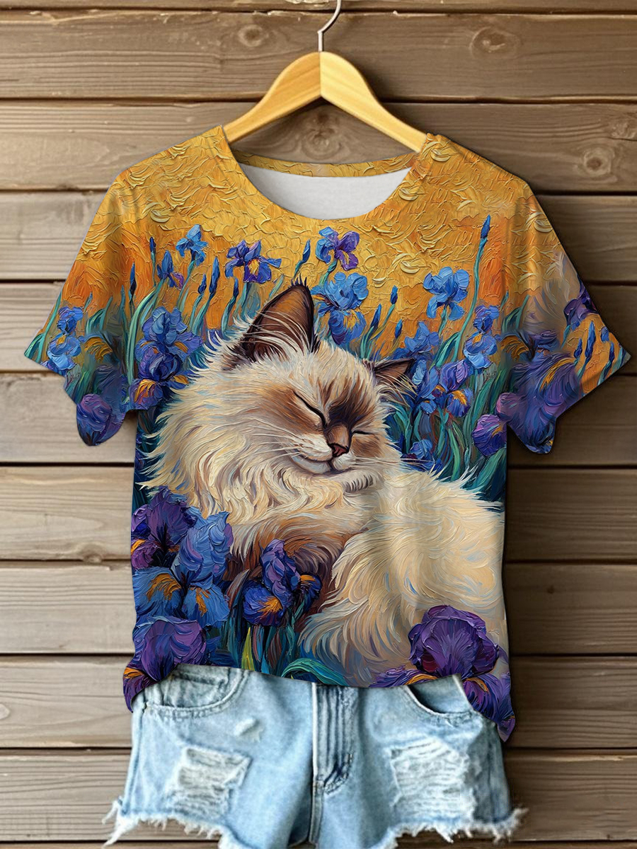 Women's Oil Painting Cute Flowers Cat Short-sleeve T-shirt