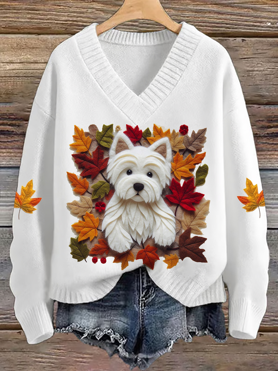 Women's Dog Maple Leaf V-neck imitation sweater