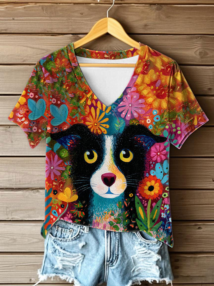 Women's Dog Printed V-neck T-shirt