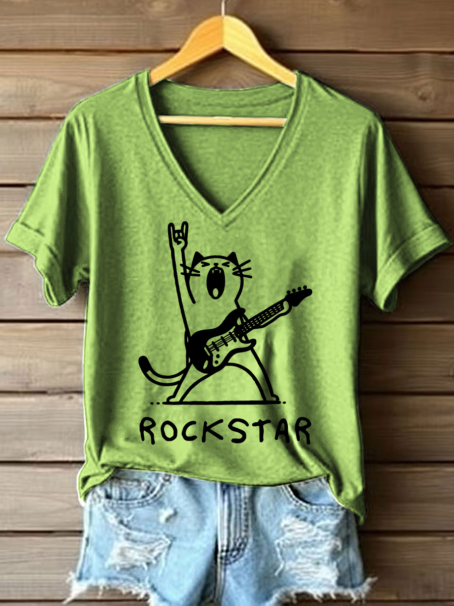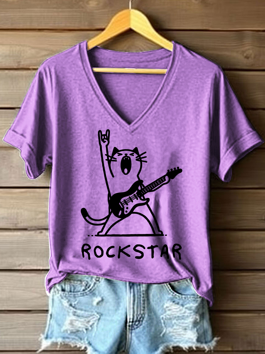 Women's Rock star Cat Print V-Neck T-Shirt